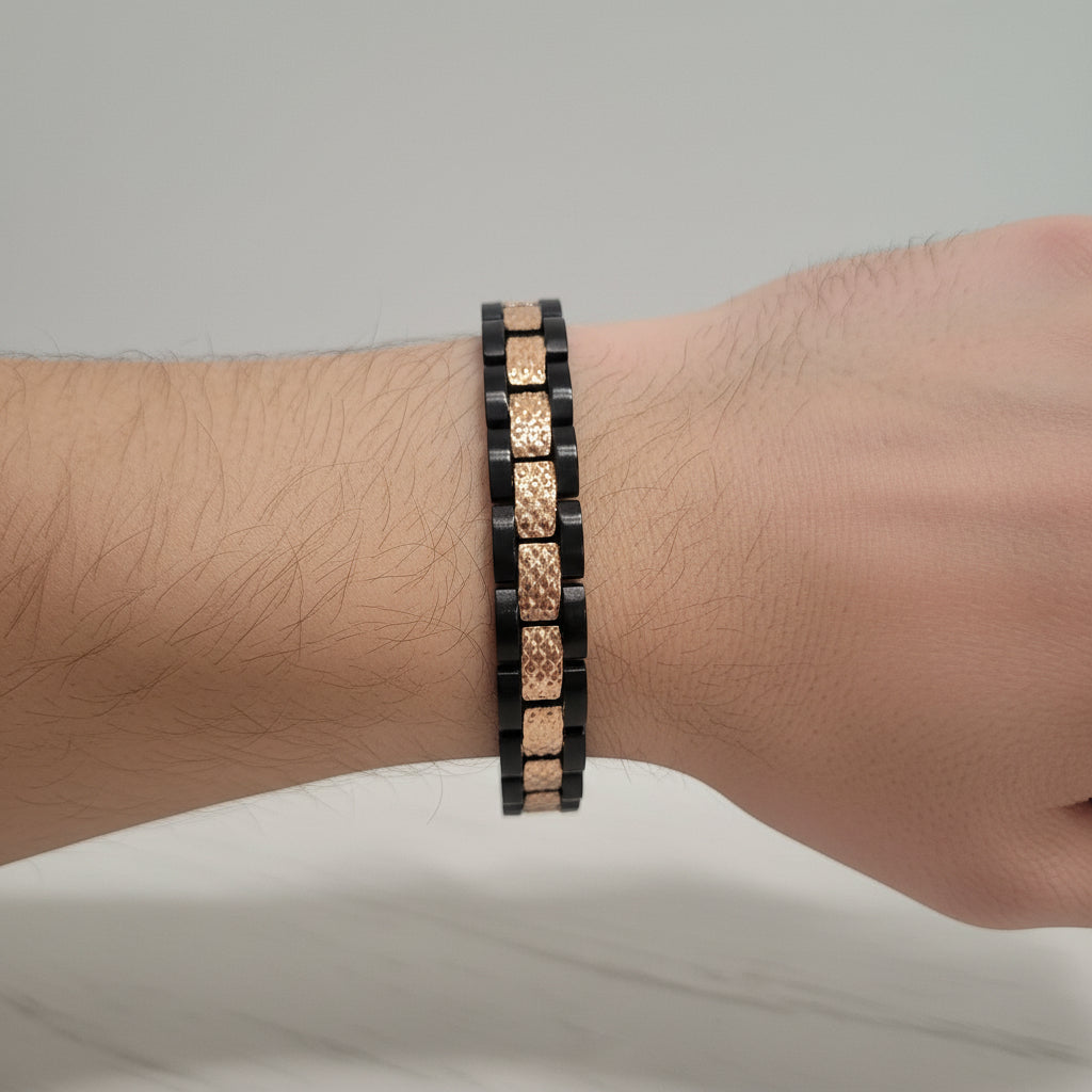 Bracciale da uomo in acciaio bicolore nero e oro. Design moderno e raffinato, perfetto per l'uomo che ama lo stile contemporaneo con un tocco di eleganza.