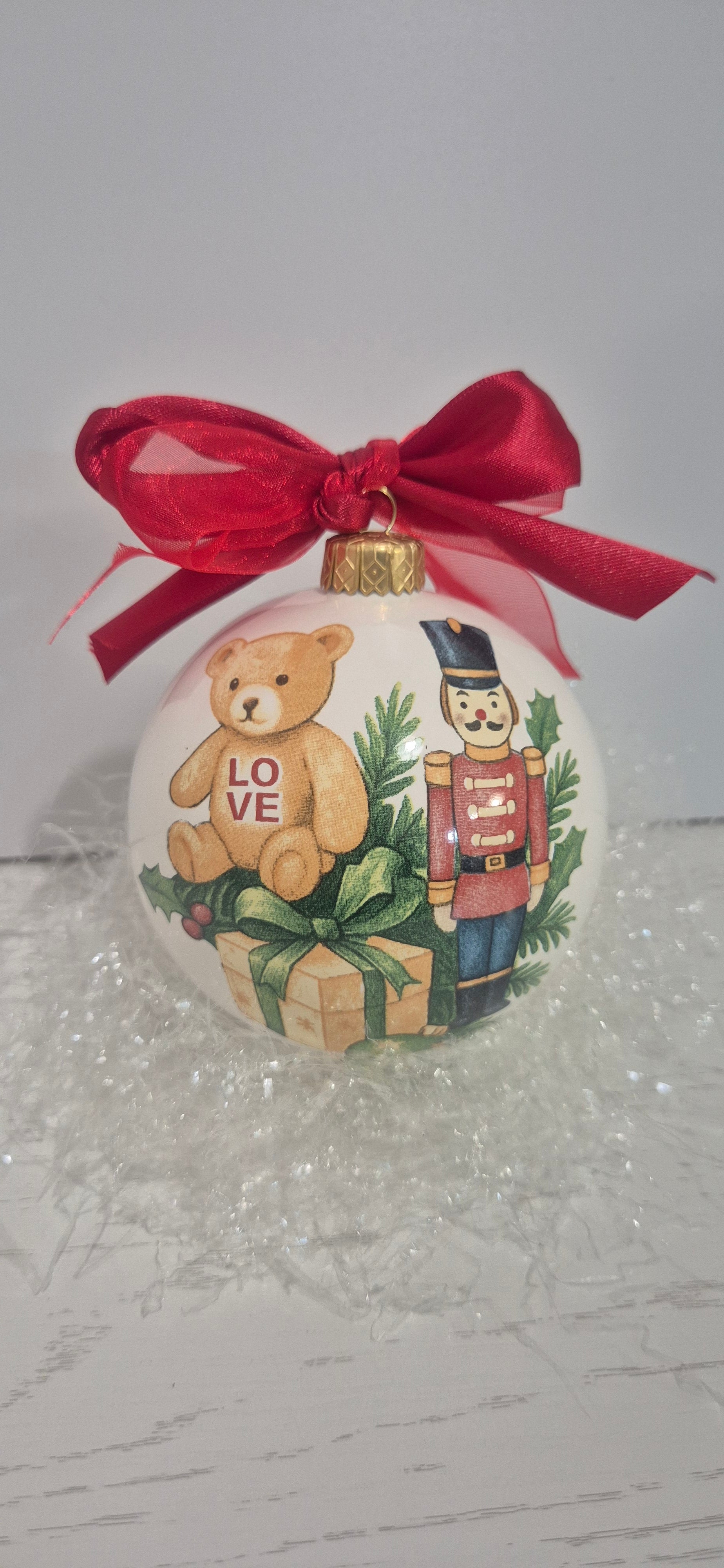 Sfera di ceramica Natale con decoro cavalluccio a dondolo oppure Orsetto Teddy dipinto e fiocco in raso e organza